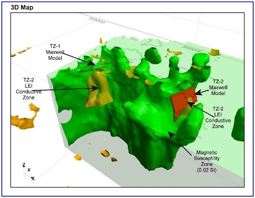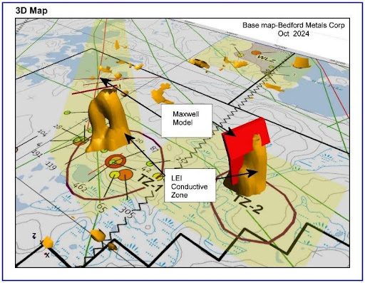 Figure 1: 3D view of VTEM LEI and Maxwell modeling for TZ-1 and TZ-2. (Base map from Bedford Metals Corp. Oct 2024)Figure 2 shows the EM results shown in Figure 1 but as well, the 3D magnetic susceptibility model created from the VTEM magnetic results. The TZ-1 EM results do not show a direct magnetic association whereas the TZ-2 results show there to be a coincident magnetic response associated with the Maxwell plate at depth.