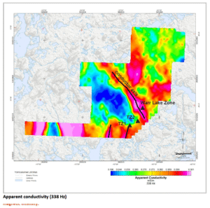 The survey covered 747 line-kilometers at 100-meter spacing and utilized advanced heliborne MobileMT technology, capable of detecting geoelectrical activity at depths of up to one kilometer with high spatial and resistivity resolution. This method has been widely used in uranium exploration across the Athabasca Basin for identifying conductive zones within magnetic breaks—geophysical features often associated with uranium mineralization.